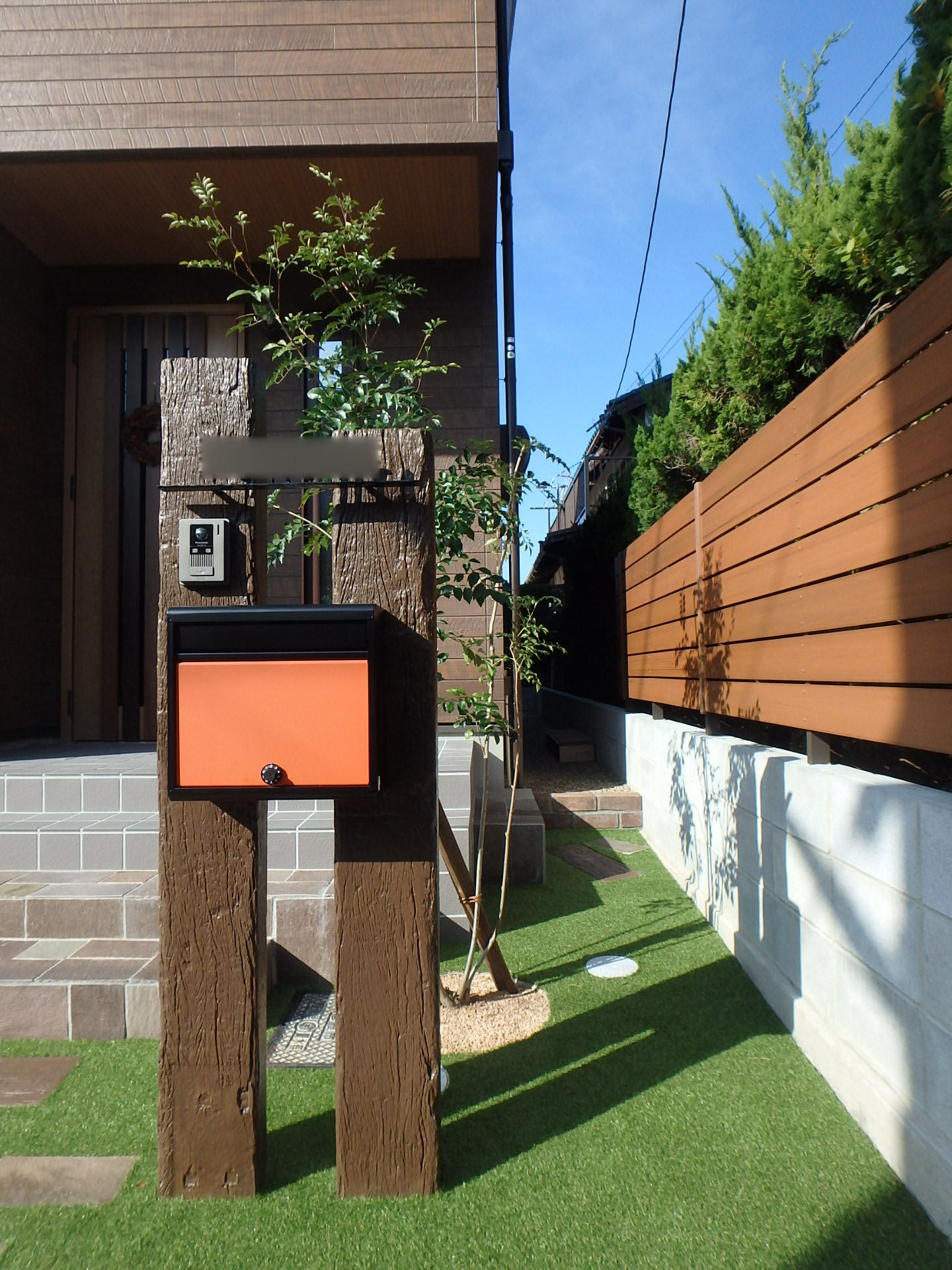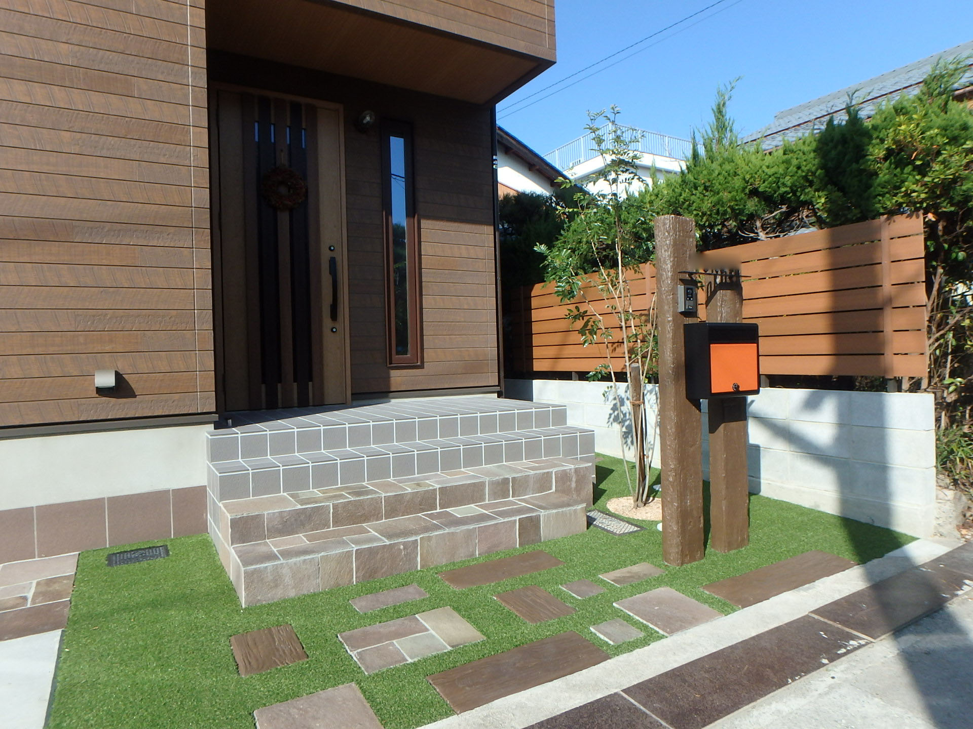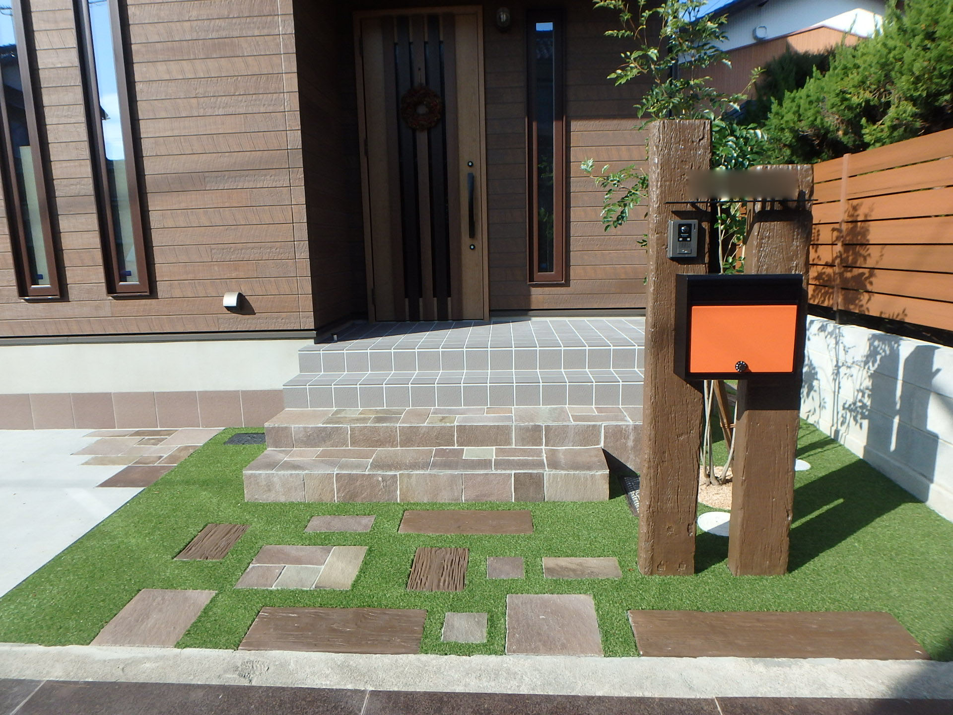 枕木風の擬木とジャワ鉄平石を使ったアプローチでナチュラルガーデンを演出