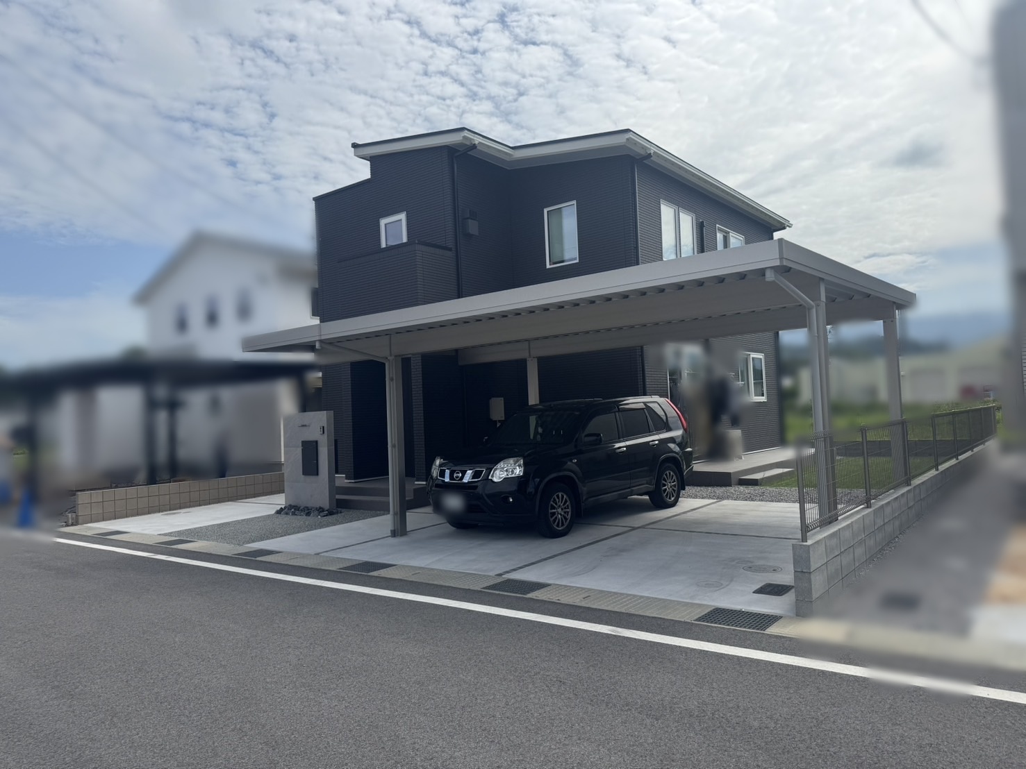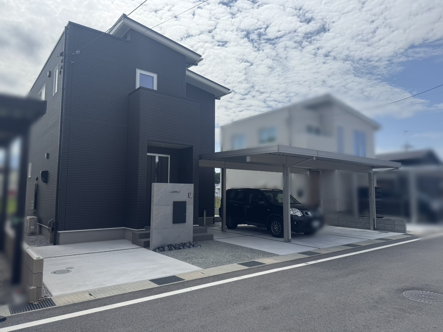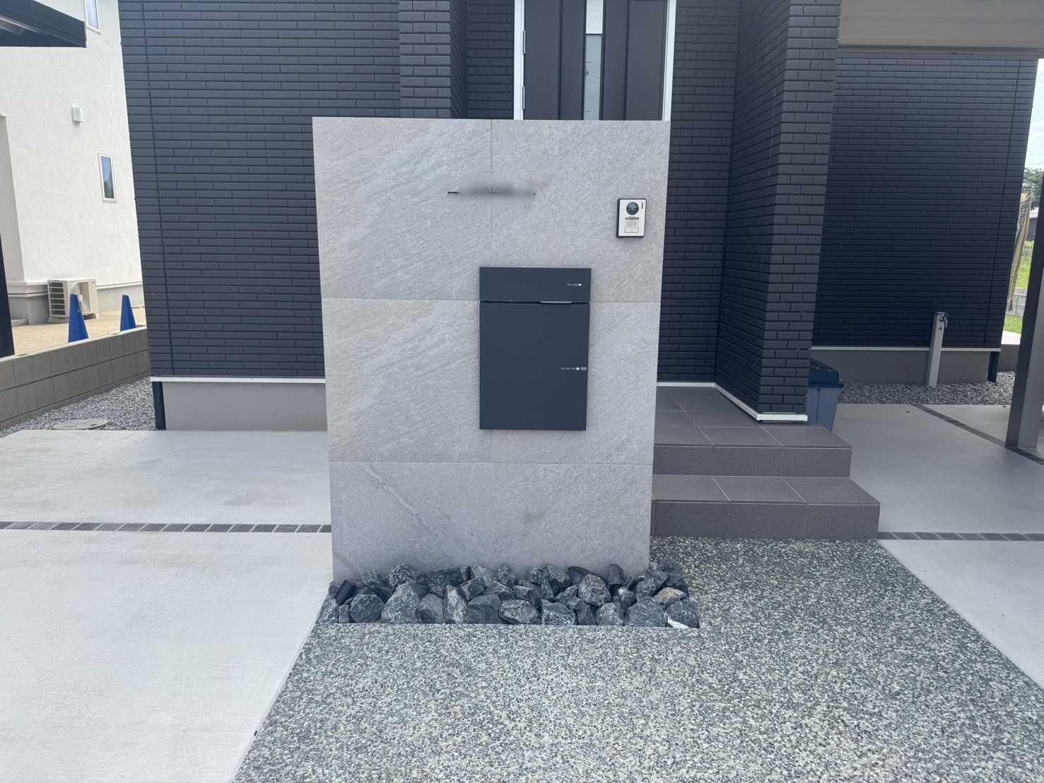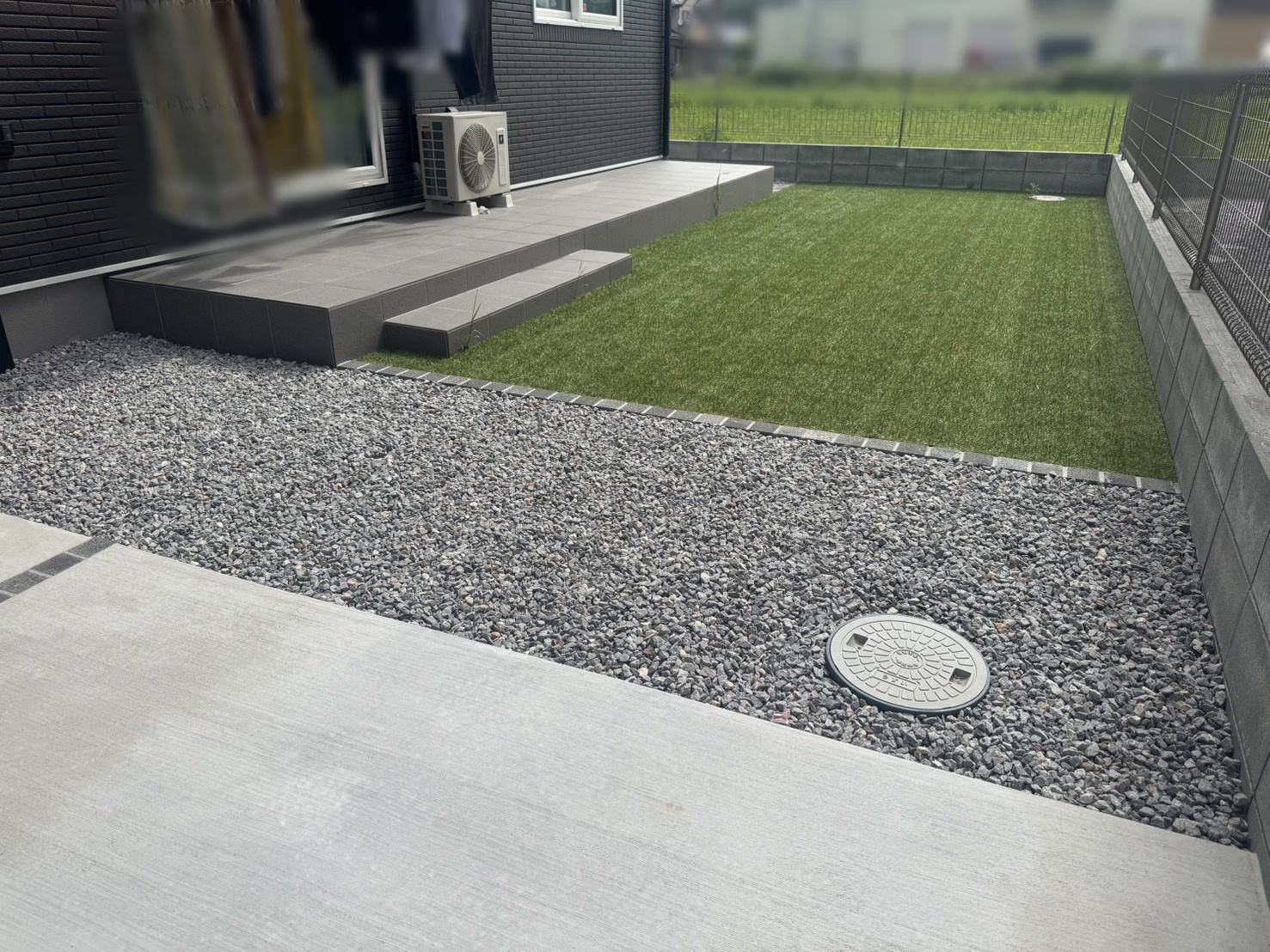 タイル張りの高級感ある門壁。広々としたデッキ。人工芝での楽しい雰囲気もそうぞうできます。